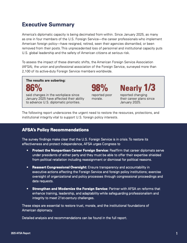The American Foreign Service Association (AFSA) has issued a report, “At the Breaking Point” documenting the destructive measures taken against the Foreign Service and Foreign Service officers. Here is the executive summary of the report.